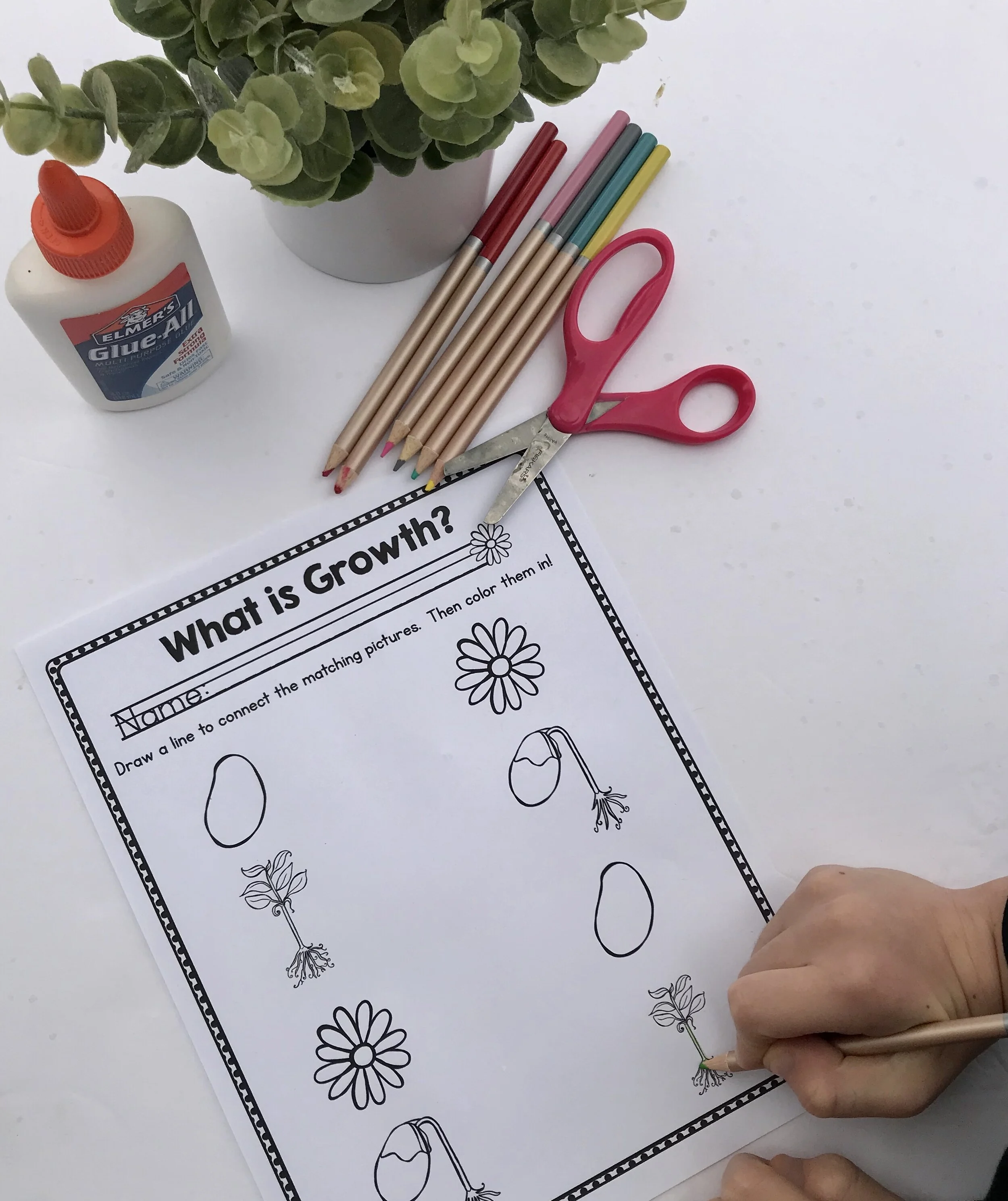 Each of the two main examples of growth is presented with an anchor chart and cards for pocket charts to help facilitate group discussions. To help kids follow-up on the lesson presented, I’ve included a coloring sheet, cut-and-paste, matching activity and a journal page where they can process what they’ve learned.
