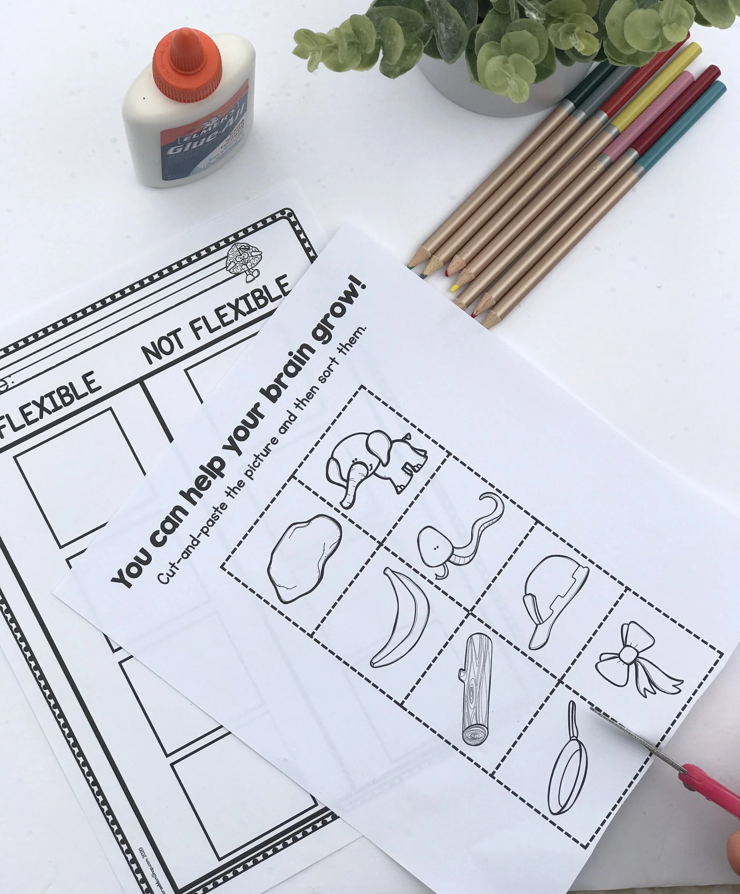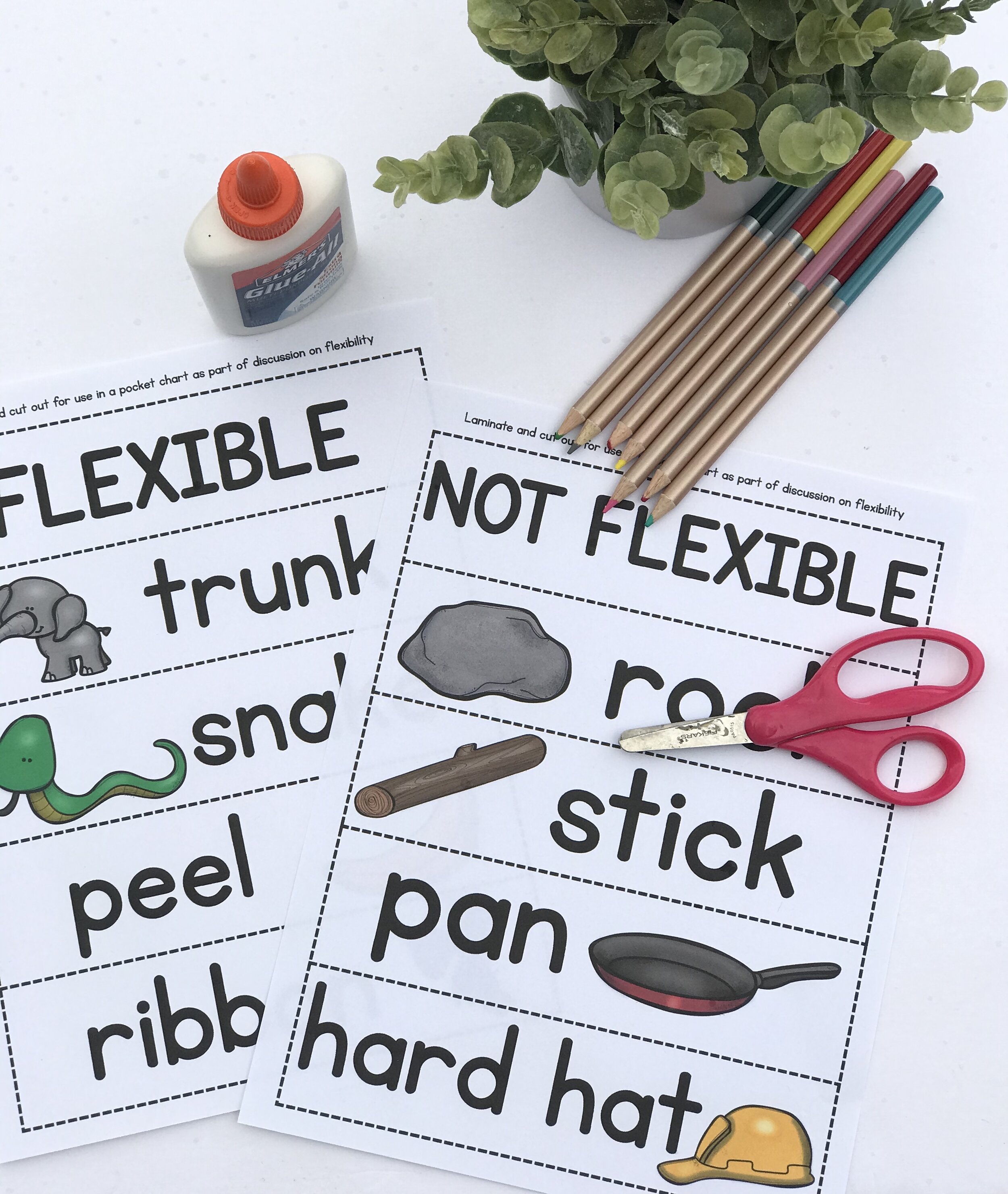 In section four I introduce the concept of cognitive flexibility. I start this by having the kids do some yoga poses or group stretches. I discuss why it’s important to have flexible muscles - it keeps them strong and healthy and prevents injuries. I then discuss how our brains are healthier when they are flexible too! I use pocket chart cards, anchor charts and follow-up activities to discuss what “flexible” means in a literal sense.